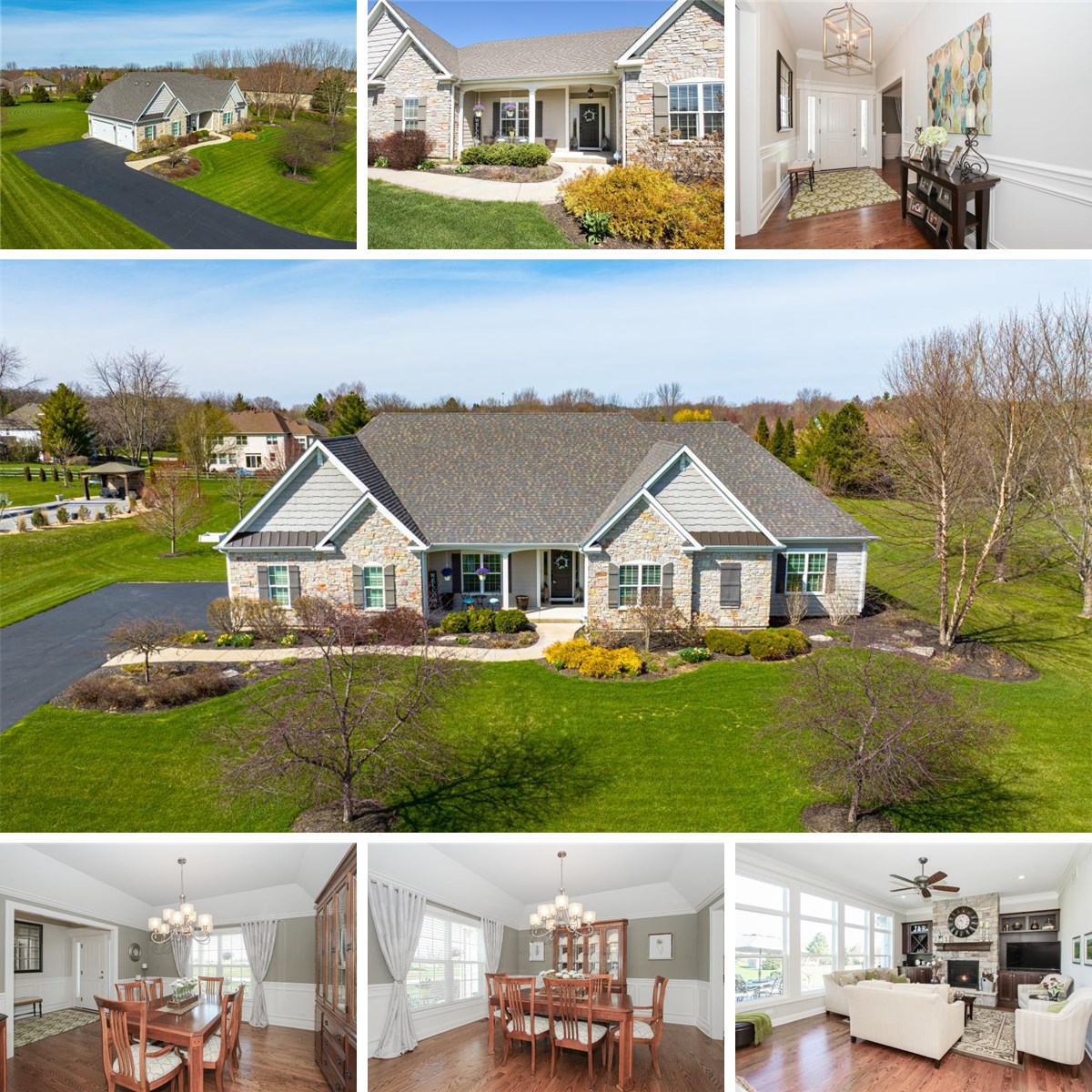 Exquisite custom built ranch nestled on a beautifully landscaped one acre lot, offering over 2600+ sq ft of refined living space enriched with exceptional architectural detail and timeless millwork. Designed for both comfort and elegance the open concept layout is complemented by a stunning formal dining room that sets the stage for unforgettable gatherings - highlighted by intricate millwork and elegant statement ceiling and the perfect ambiance for both grand entertaining and intimate dinners. Dramatic Chef lover's dream kitchen is richly appointed with SS appliances, quartz and granite countertops, breakfast bar, center island and an inviting eating area-perfect for intimate mornings or effortless entertaining. The adjacent great room is the heart of the home, featuring a stone fireplace and a breathtaking wall of windows that bathe the space in natural light while showcasing serene and backyard views. Retreat to the expansive primary suite, a true sanctuary with a luxurious bath designed for relaxation. Additional bedrooms are generously sized, including a versatile second bedroom ideal for a private in-law arrangement or guest retreat. Convenient main floor laundry room is decked out with extra cabinets and sink. The full unfinished basement offers endless potential to create your dream lower level, while the oversized patio provides the perfect outdoor setting for quiet evenings or entertaining. A three car spacious garage completes this exceptional offering. A rare blend of sophistication, warmth and timeless comfort-this home is as inviting as it is impressive.